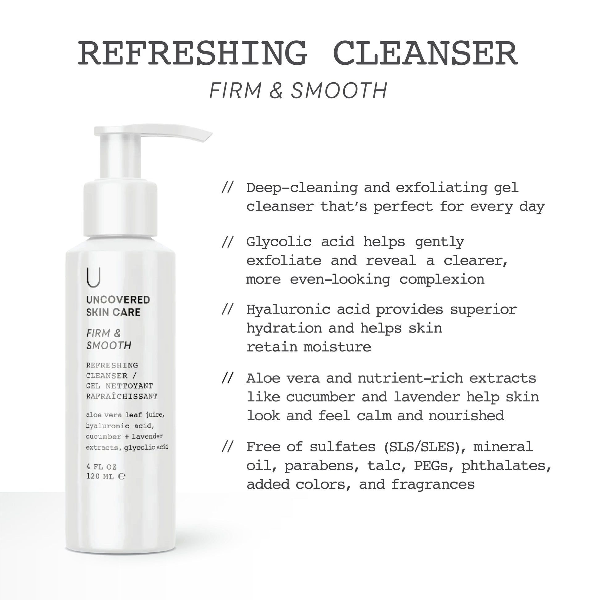 Experience a gentle, powerful clean with our Refreshing Cleanser. Glycolic acid helps exfoliate and reveal a clearer, more even looking complexion, while hyaluronic acid penetrates to help moisturize and make skin feel firm. Dispense one pump, massage over your wet face and neck, and then rinse as part of your daily skin routine.