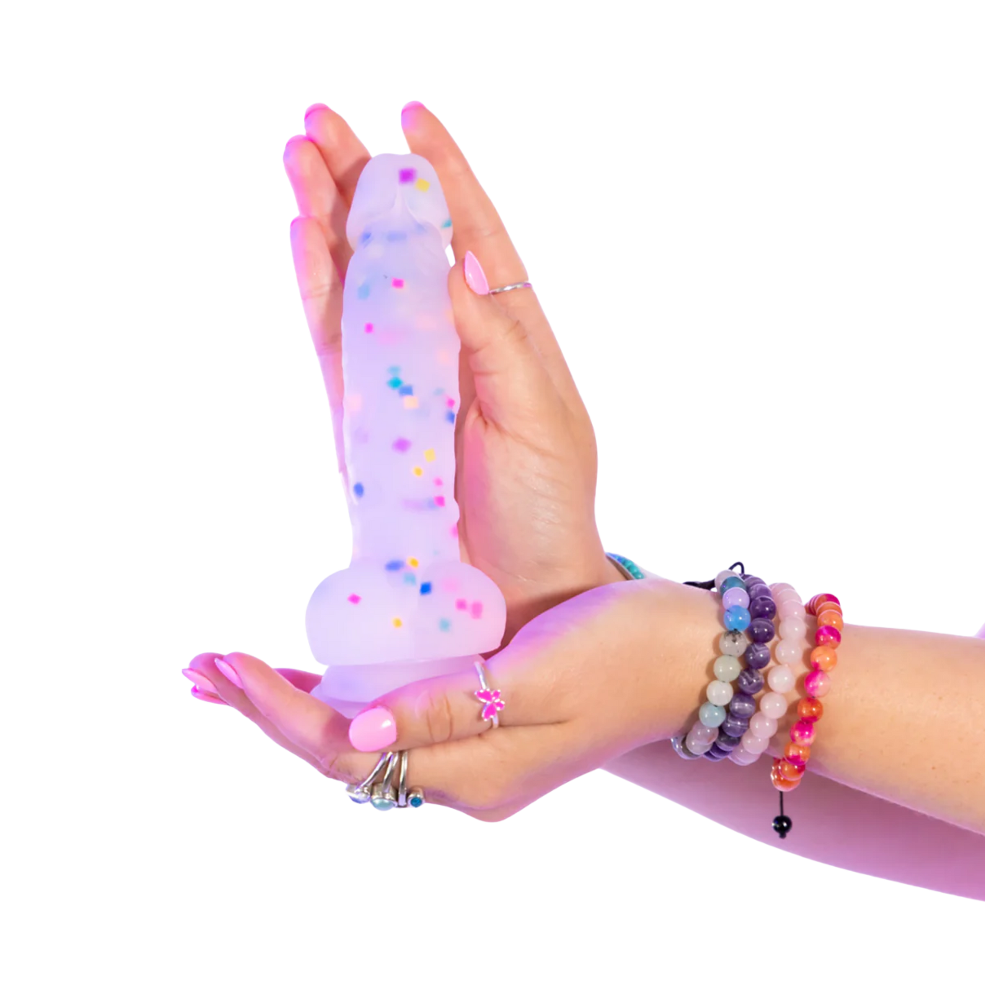 We all want a party in our pants, and COCK-A-PALOOZA is here to deliver. This FUNFETTI, confetti filled dildo is sure to provide an intense explosion! Cock-A-Palooza is a silicone dildo that is perfect for vaginal or anal play. Cock-A-Palooza’s suction cup base makes play time secure and pleasurable, whether using the base as a handle or sticking to a flat surface for a wild ride! Cock-A-Palooza is also harness compatible, making this a great toy for partner play.